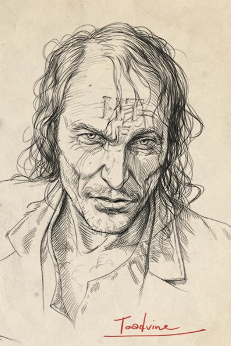 | Louis Toadvine | A branded fugitive, Toadvine first appears in Nacogdoches, Texas, where he almost murders the kid after a petty altercation, though they soon become compatriots and burn down a hotel together. The two find themselves in one another's company again while imprisoned in Chihuahua City along with Grannyrat. Toadvine secures their freedom by enlisting them all in Glanton's gang of scalp hunters. Toadvine is a somewhat complex character: he is a capricious murderer who goes so far as to kill a prison overseer and macabrely fashion his golden teeth into a necklace, yet he nonetheless violently objects when the Judge plays with, only to slaughter and scalp, an Apache infant. Some time after the Yuma massacre on the Colorado River and its aftermath, Toadvine, along with David Brown, is executed by hanging in Los Angeles. |